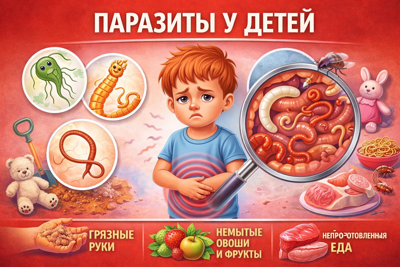 Паразитарные инвазии у детей могут вызывать ряд gastrointestinal симптомов, включая боли в животе, диарею, потерю аппетита и замедление роста. Для диагностики используются следующие методы: